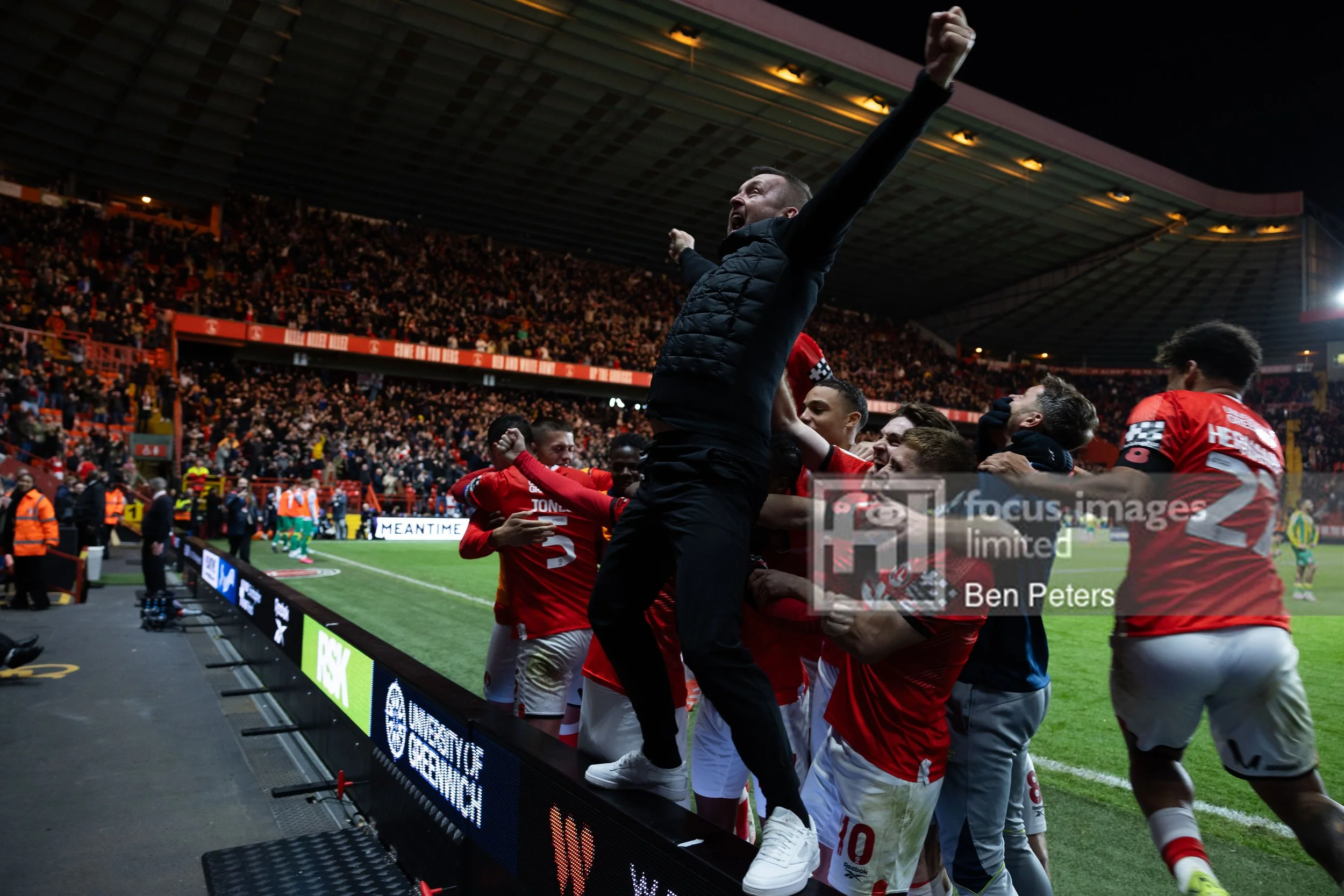 Charlton Athletic Manager Nathan Jones celebrates after Sonny Carey of Charlton Athletic scores a last minute winner in Sky Bet Championshio match between Charlton Athletic and West Bromwich Albion - Shot for Focus Images