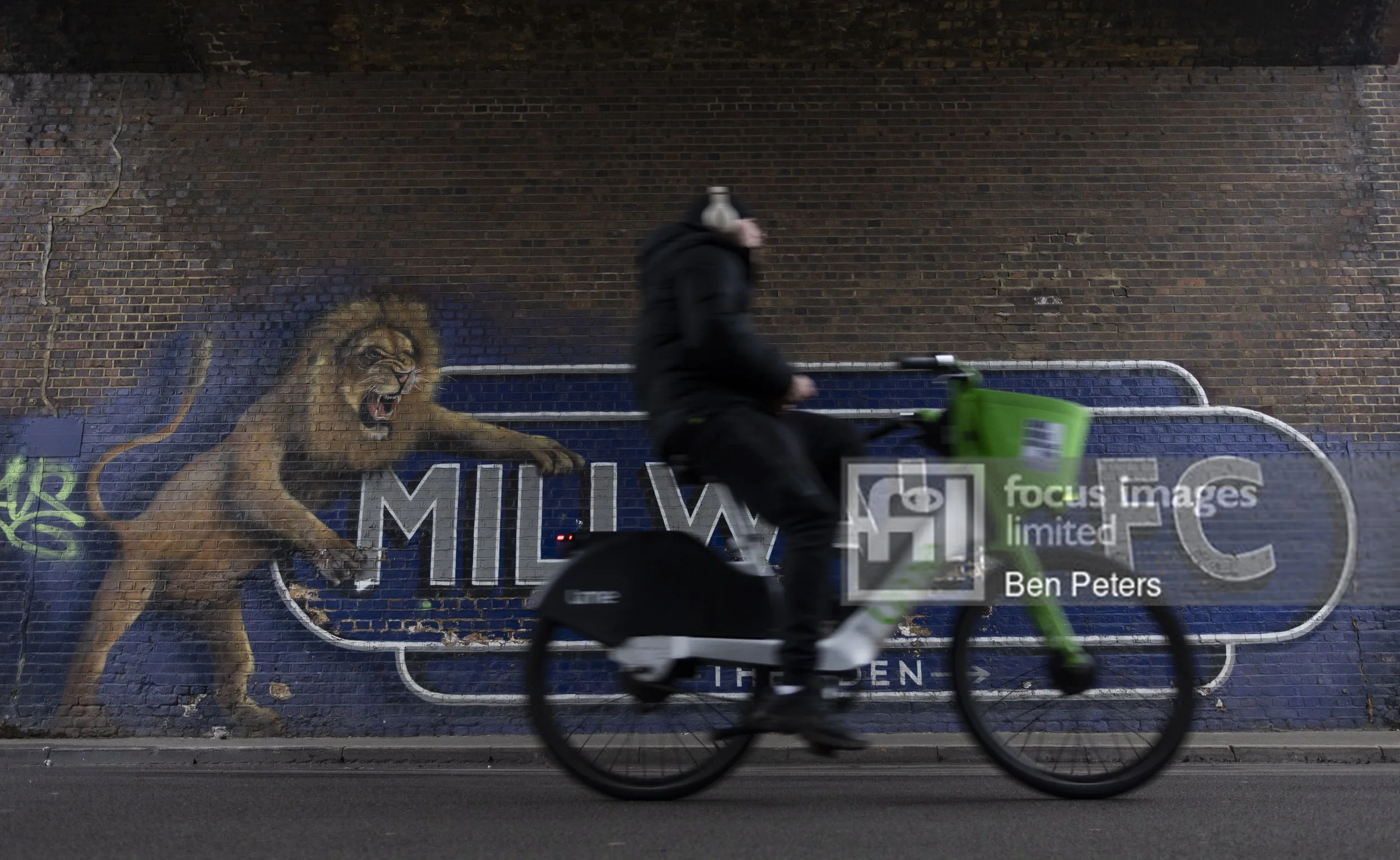 A Lime Bike user cycles past a Millwall mural - Shot for Focus Images